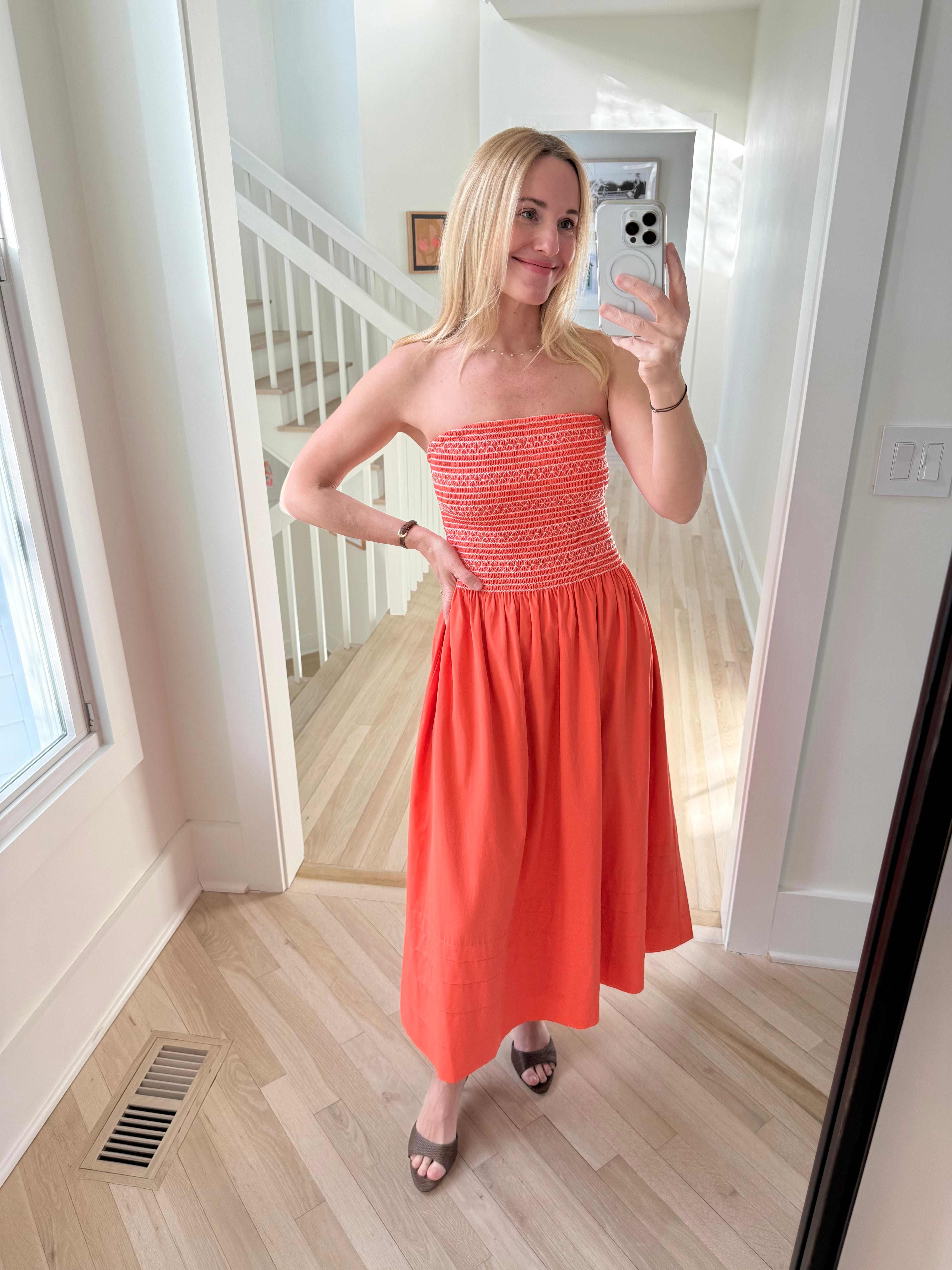 I am so impressed by the quality of this orange smocked dress. The cotton poplin is one of the softest I’ve ever felt, and the top is so structured and pretty. Cut with a white sweater thrown over the shoulders. I have the XS. And I’m wearing these heels.