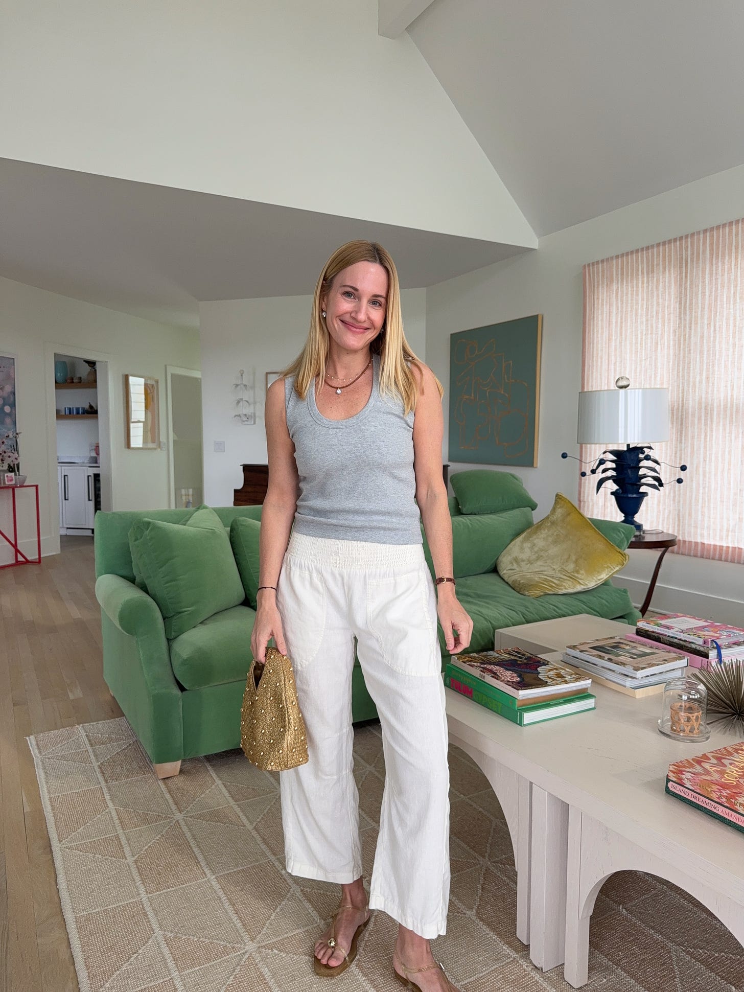 You gotta have a pair of comfortable pants that you can throw on with a tank for breakfast or over a swimsuit for the pool, and I am obsessed with these elastic waist linen pants. I now want them in all the colors, I have the XS. Wearing with this tank and this bag and these jelly flats.