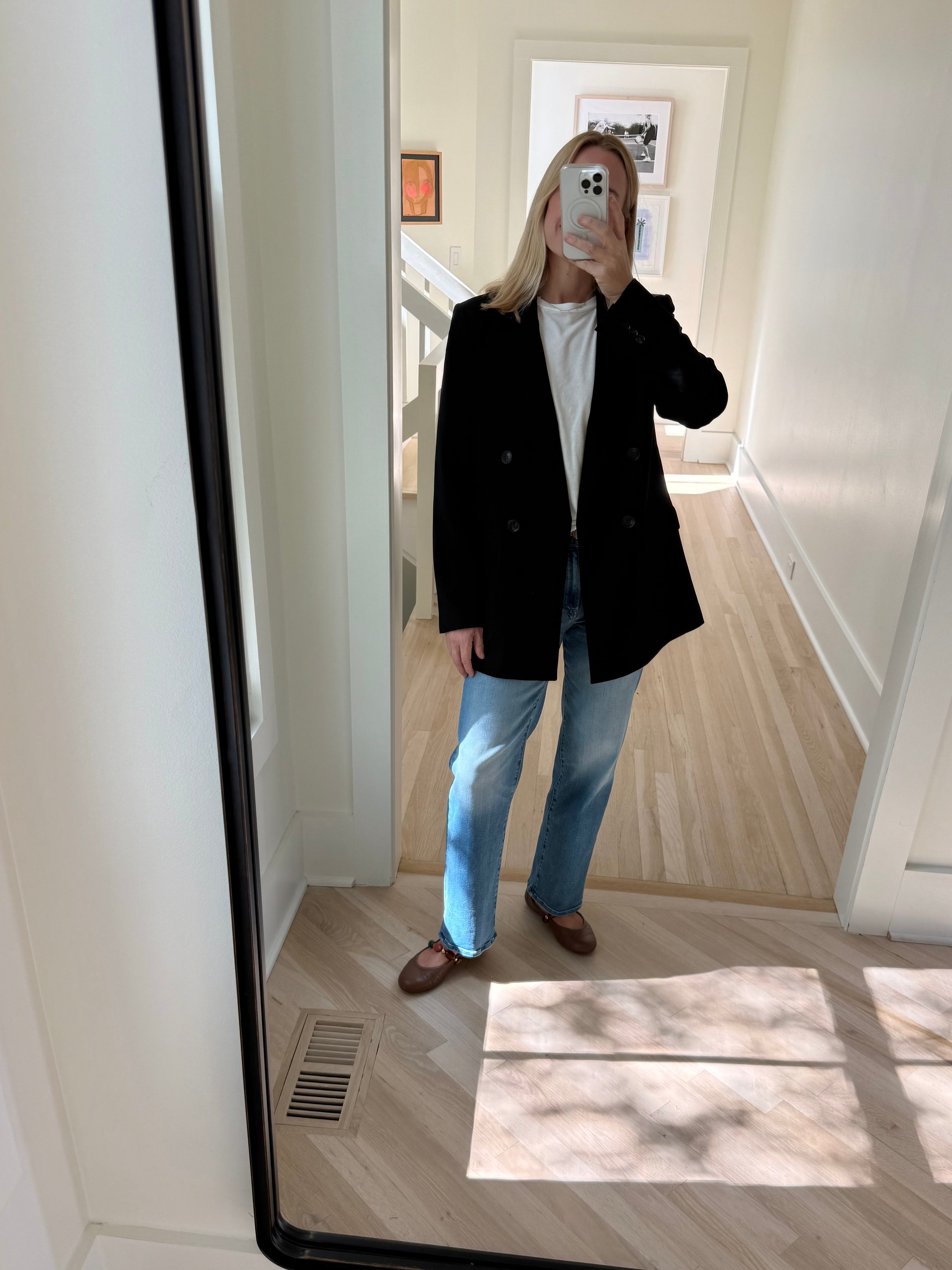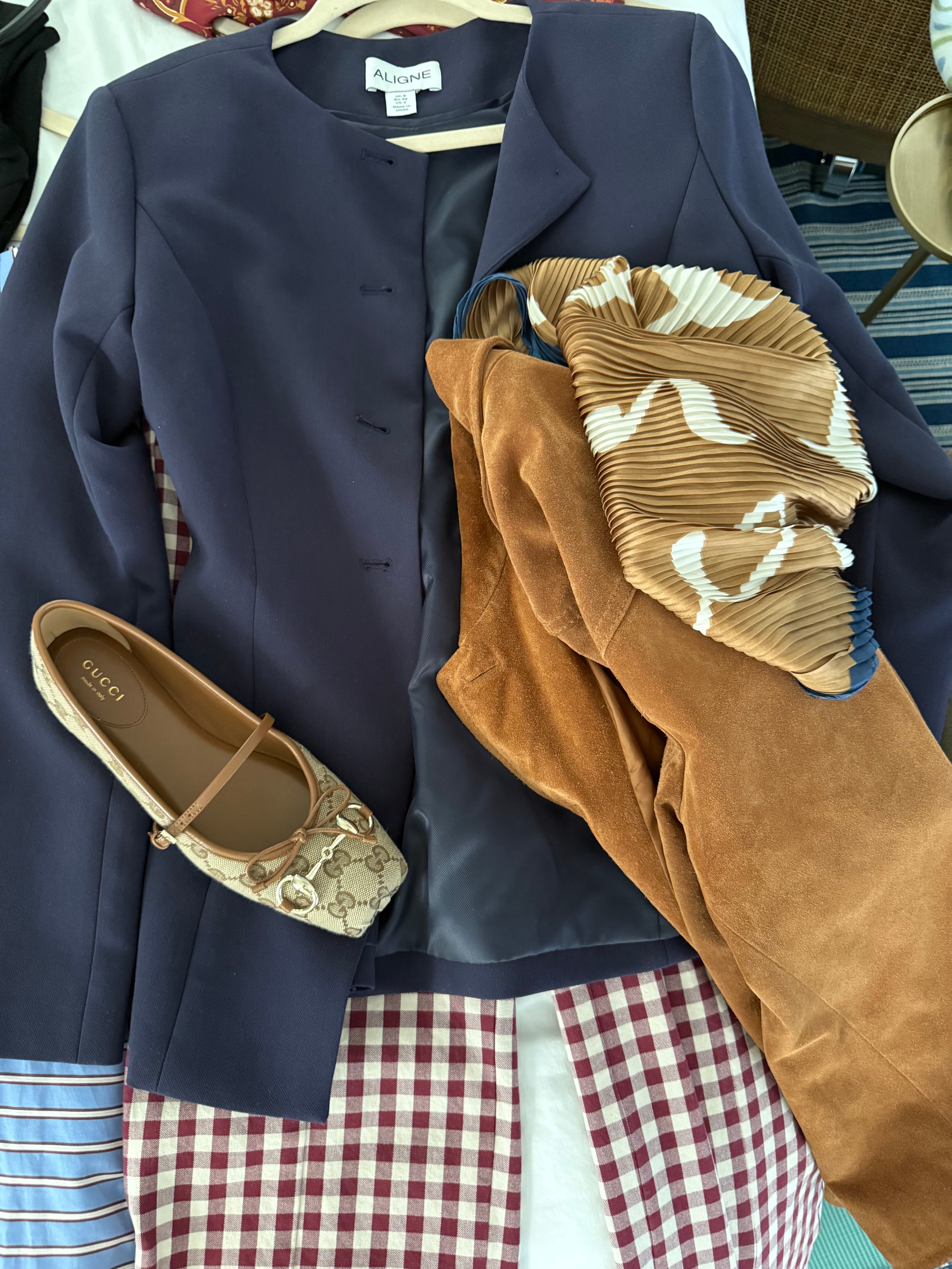 - gingham pants paired with a navy blazer top and these cute flats.