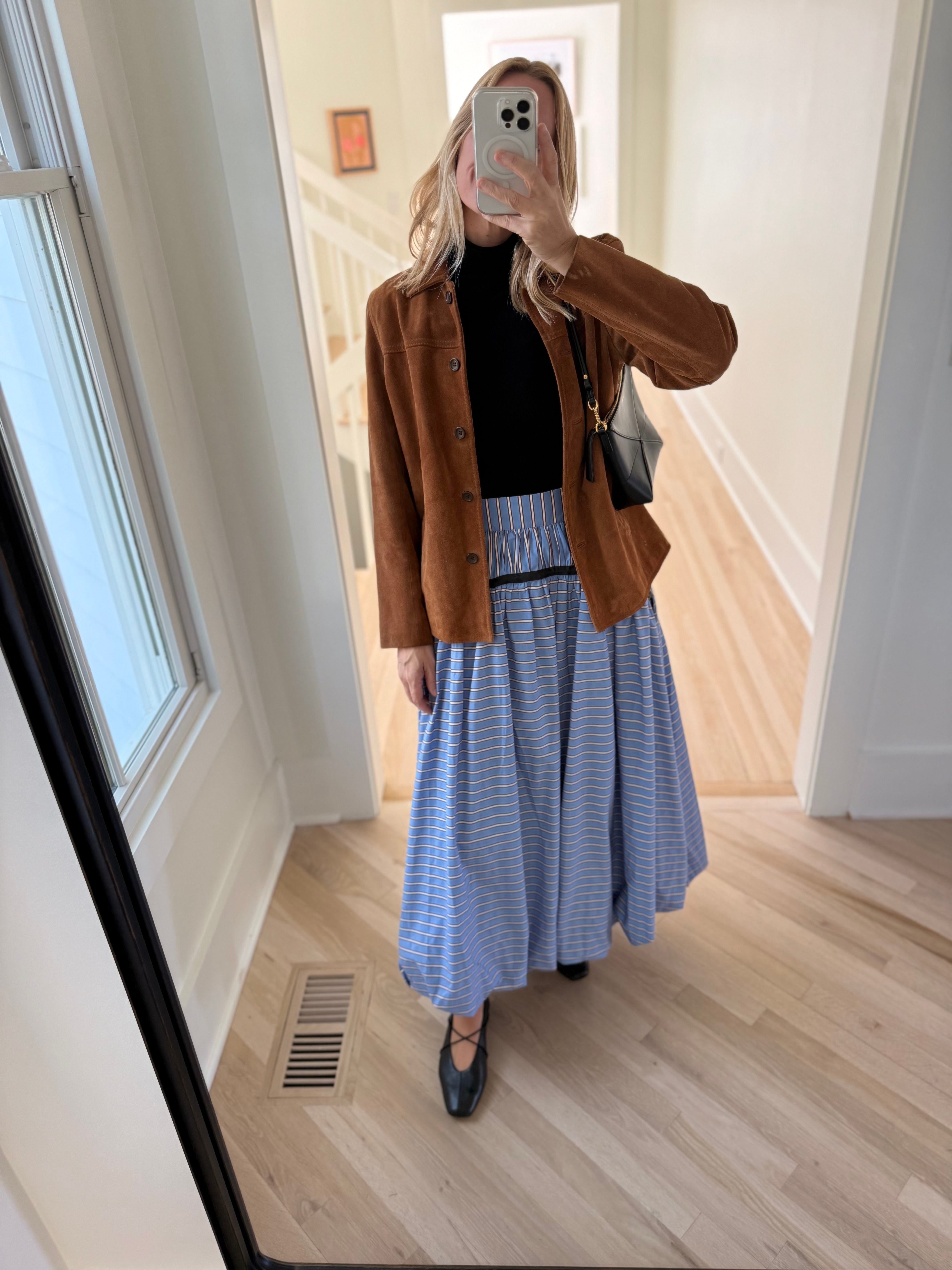 Above: blue bubble hem skirt, black criss cross flats, black turtleneck, leather jacket, black purse