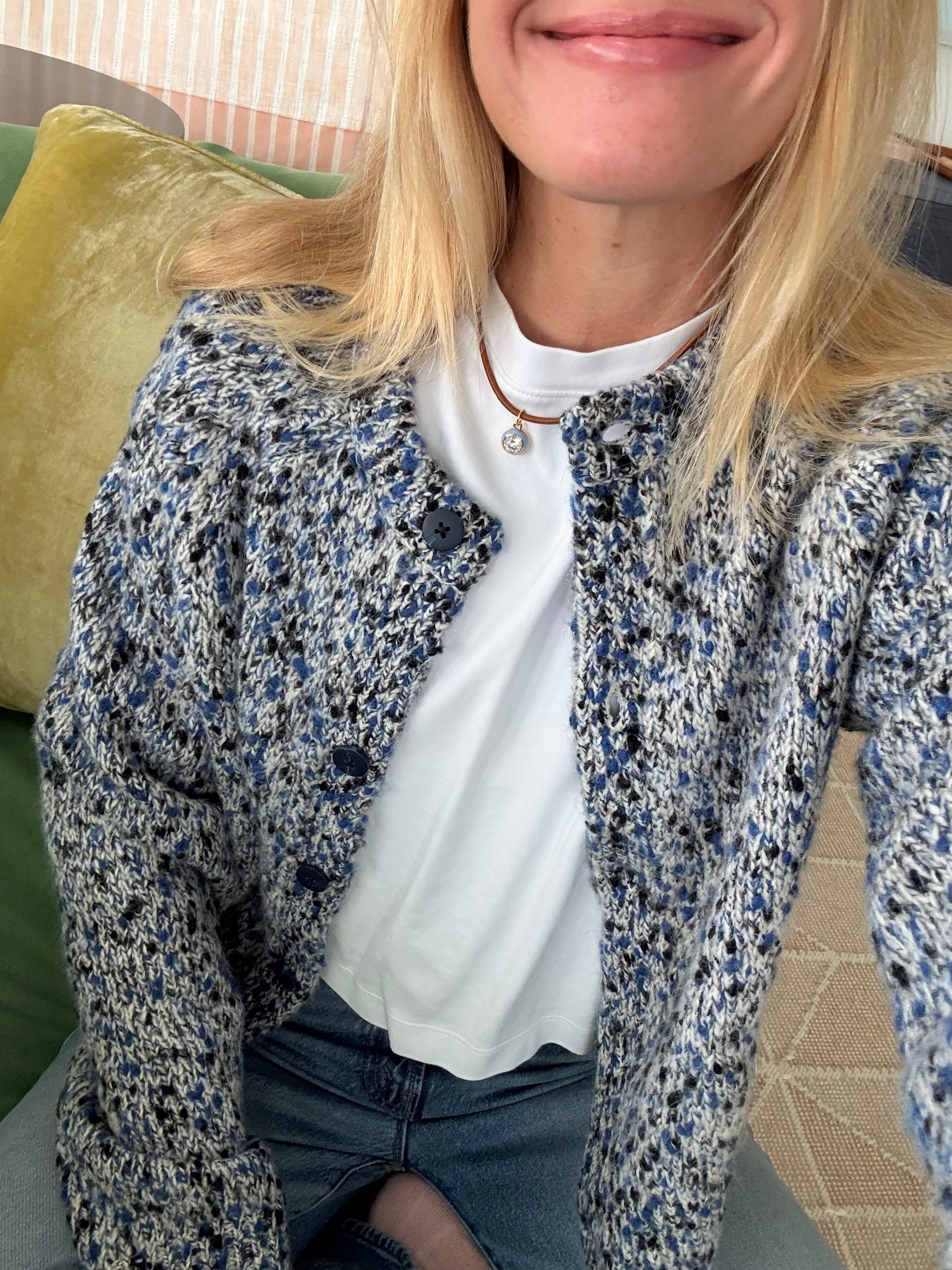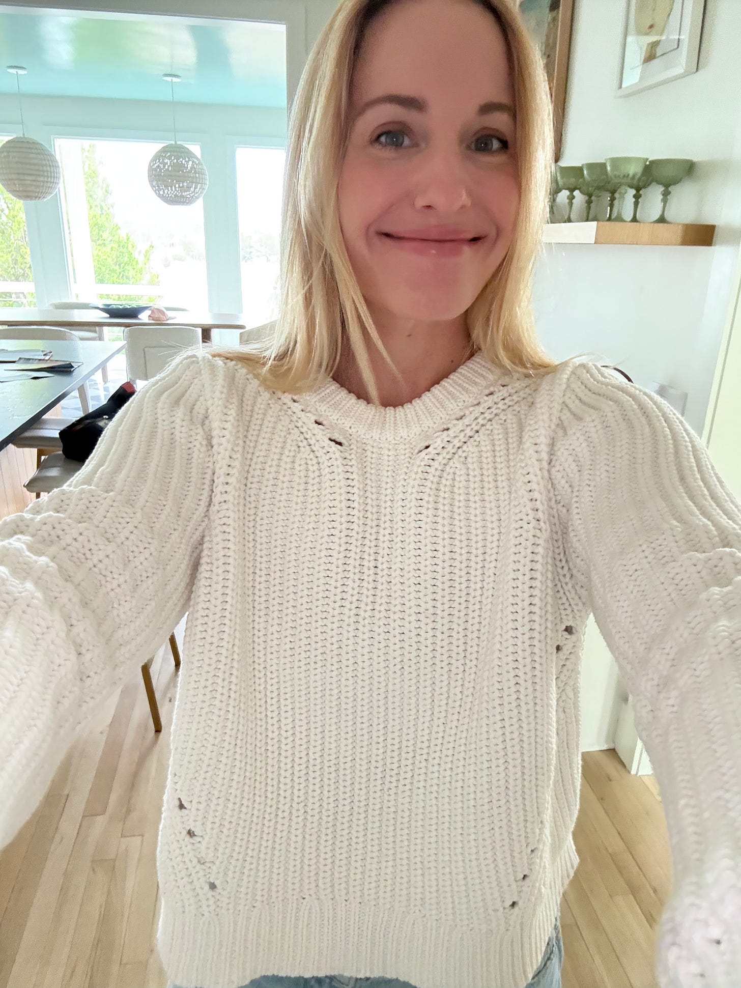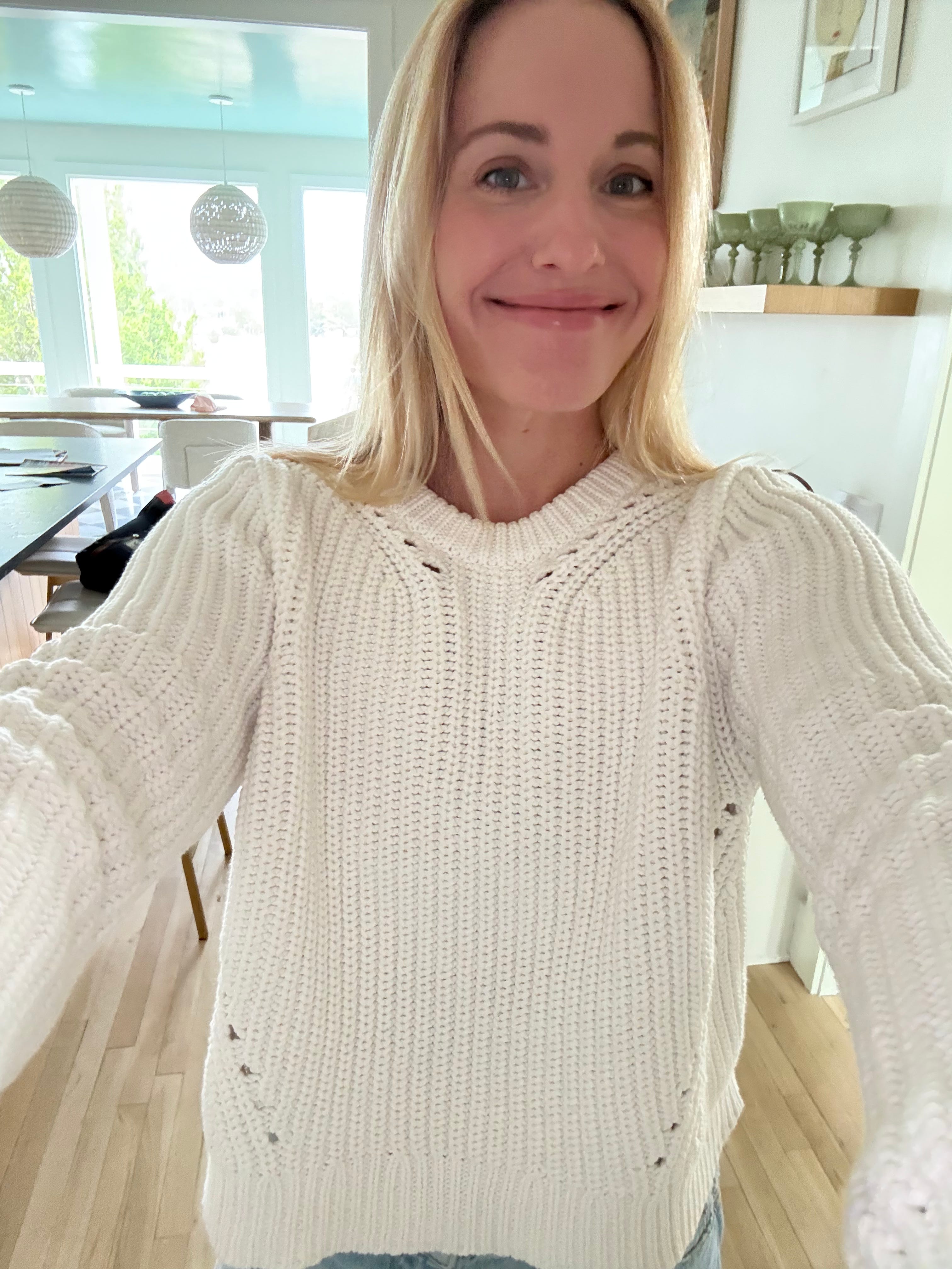 I’ve had this white sweater for a year or two, I can’t remember how long, but what I love is that it’s this chunky cotton knit that is just so cozy and fresh. She’s great thrown over shoulders as well.