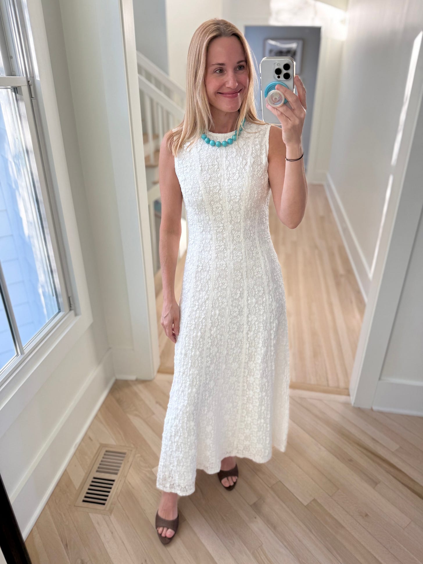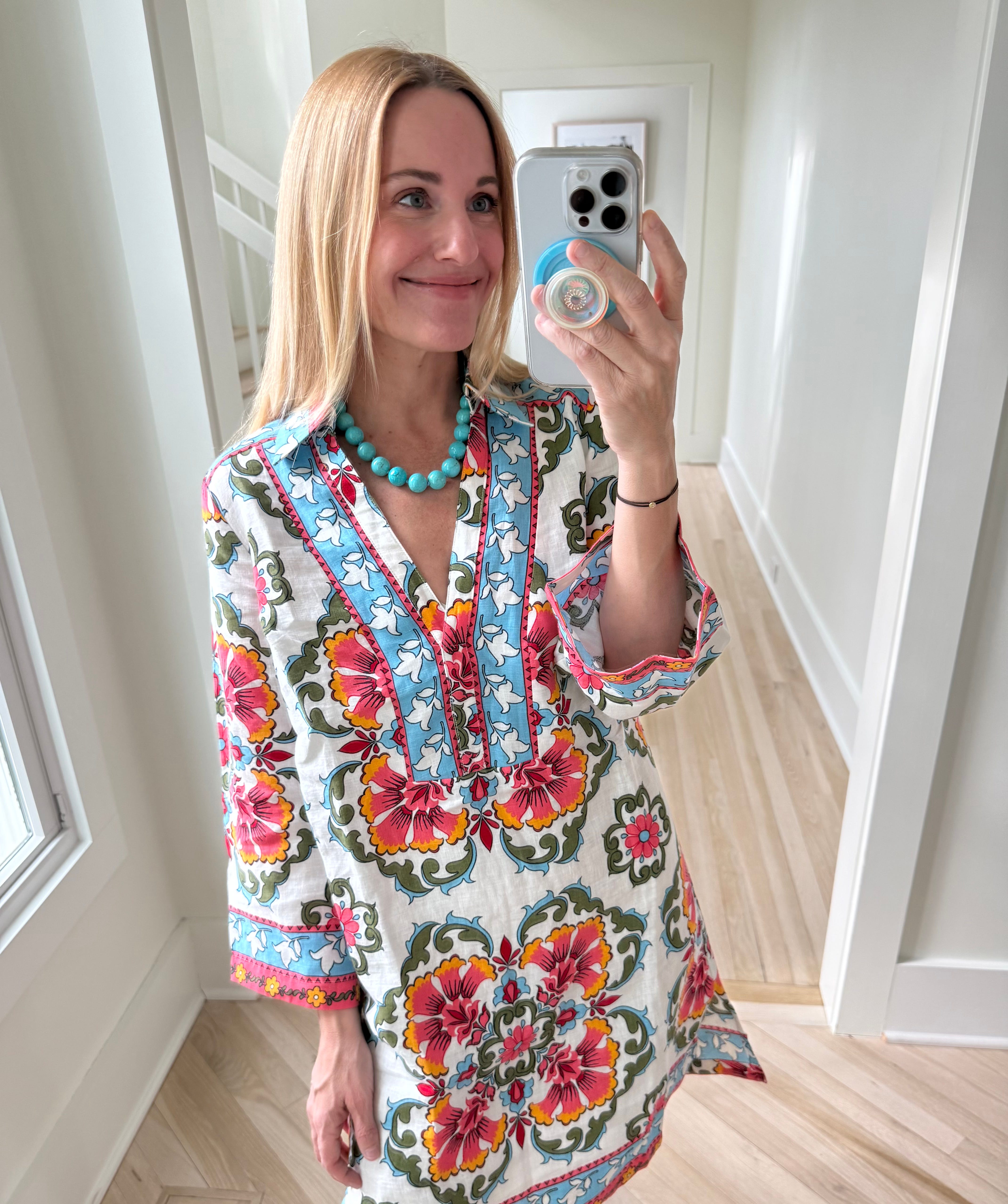 I have that black seersucker mini dress in the navy and it’s one of my favorite things. It’s super flattering thanks to the ruching and bubble hem (that stays put). Wearing with this long turquoise necklace.