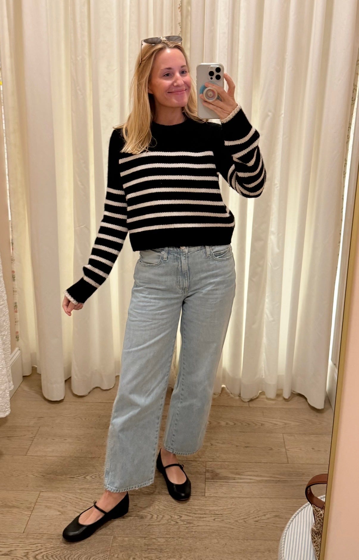 This striped sweater is a go-to fave that I have in two colors. In fact it’s my most favorite sweater I own. And these black flats are also my most favorite classic everyday ballet flat.