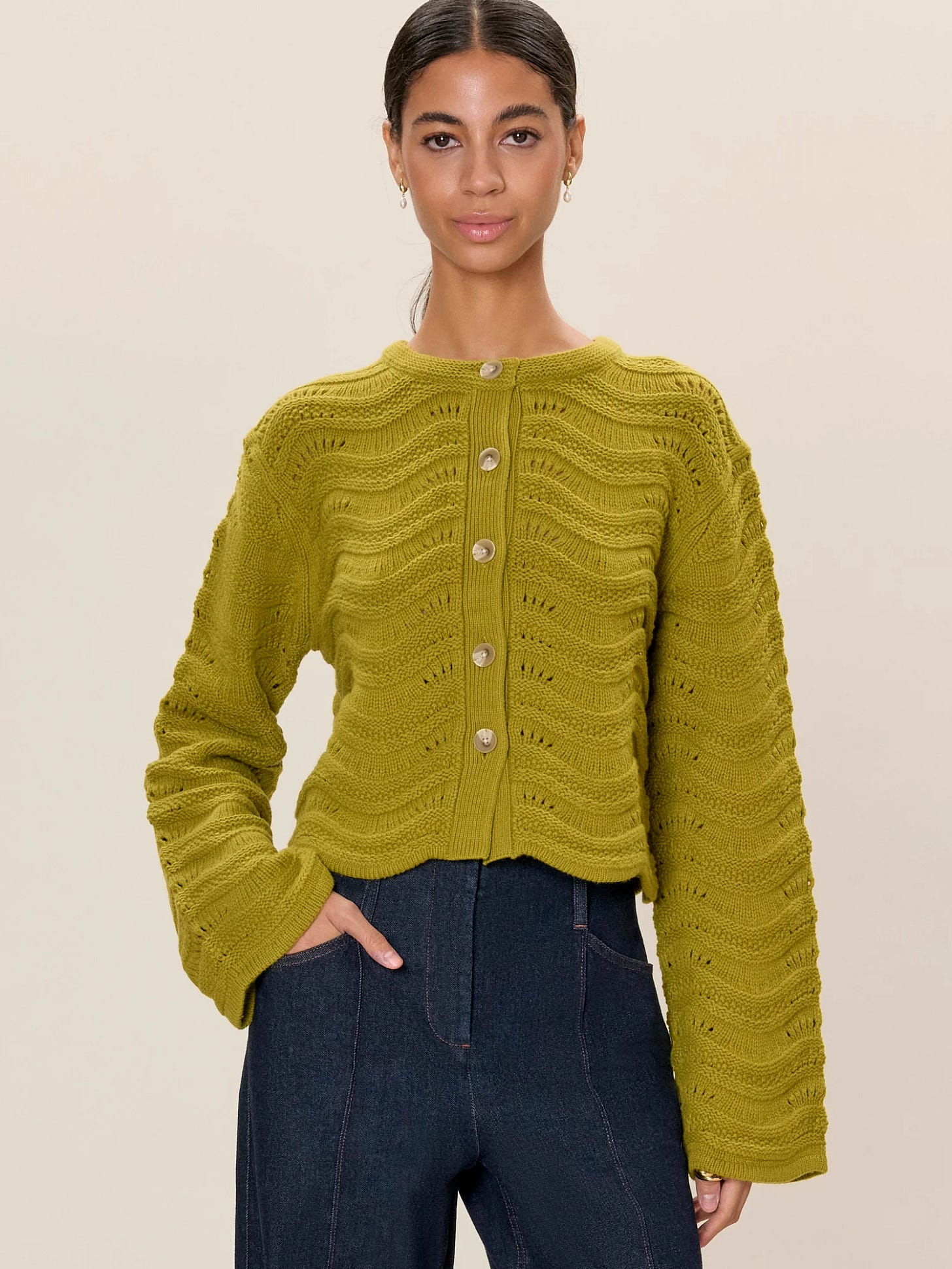 Details can make the entire look and the knit pattern detail on this button down top is incredible. I love where it hits at the waist, and also the wide (but not too wide) sleeves. If pear green isn’t your thing (why not?) then it comes in ivory, as well.