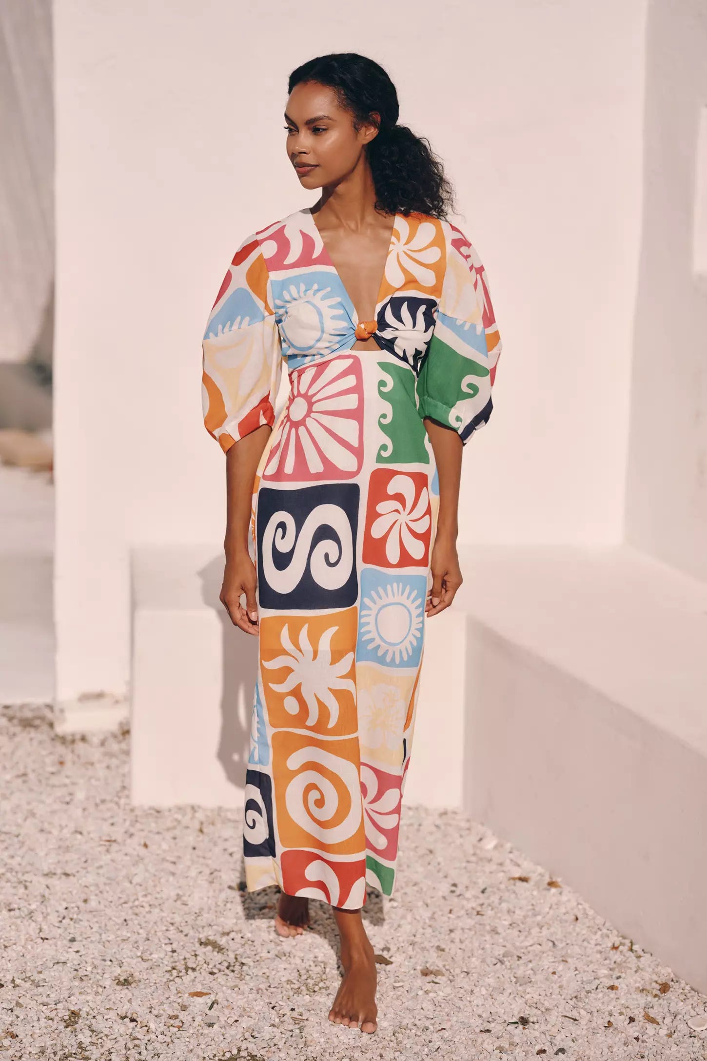 So you’re going somewhere sunny and you’re looking for the dopamine hit. This colorful dress stopped my Anthro scroll. The colors are gorgeous, the pattern is fun, and the silhouette is flattering. I love the knotted bust detail. Just hang it in my closet and I’ll already feel happier.