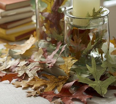 The great thing about leaves is that they are all around in the fall. Just pick a few up and spread them on your table or fill a vase with them.