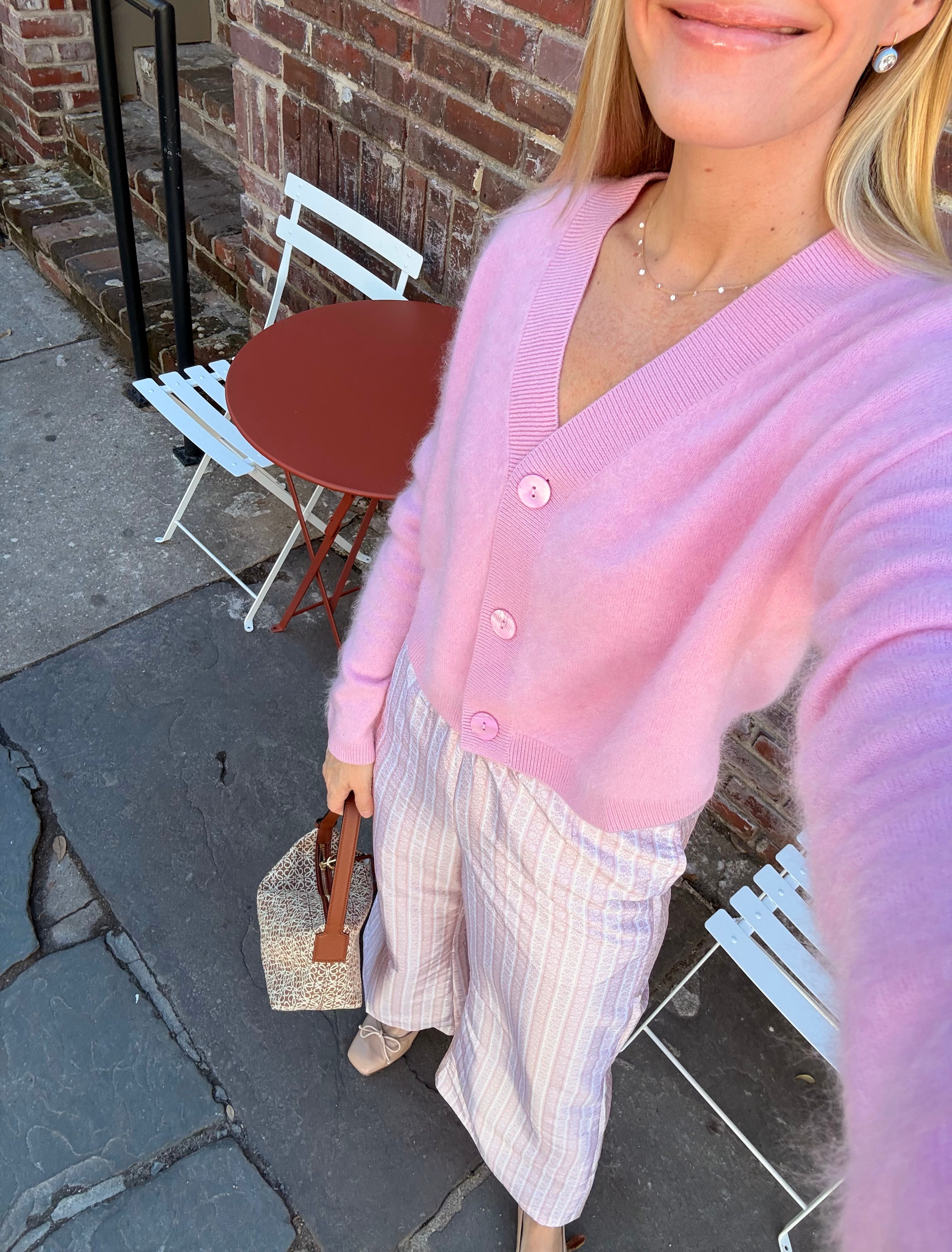 Wearing: pink cashmere cardi XS, pink printed pants XS, ballet heels, blue enamel stone earrings