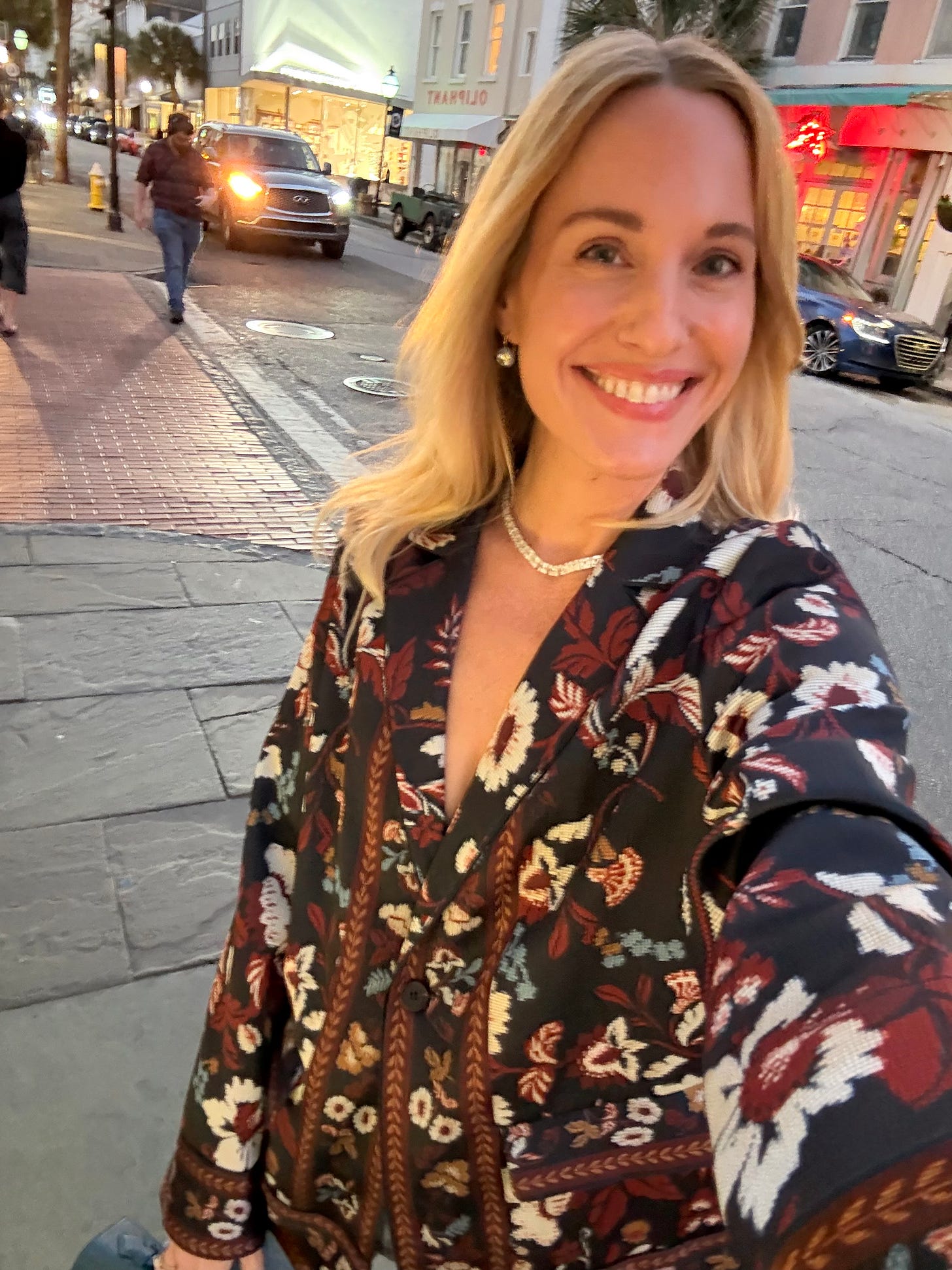 Wearing: blazer top XS, paige jeans 25, lilia sapphire necklace
