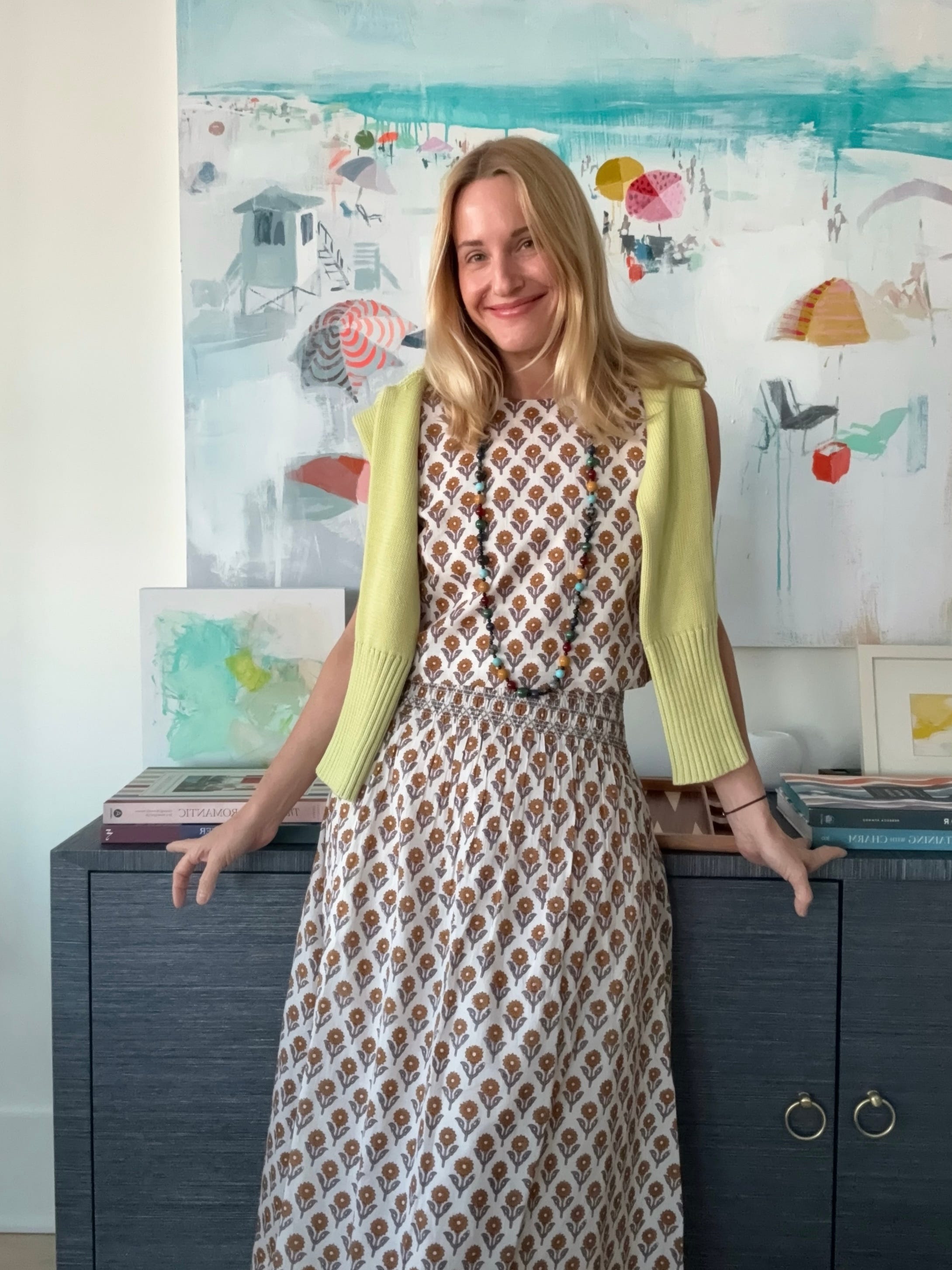 Wearing: sunflower top XS, pear sweater XS, sunflower skirt XS, beaded necklace