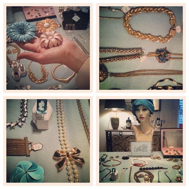My friend Deirdre Zahl, the beauty and brains behind Candy Shop Vintage, just returned from a little shopping trip with the mother load of vintage baubles. And she was sweet enough to invite me over for a little preview (aka first dibs).